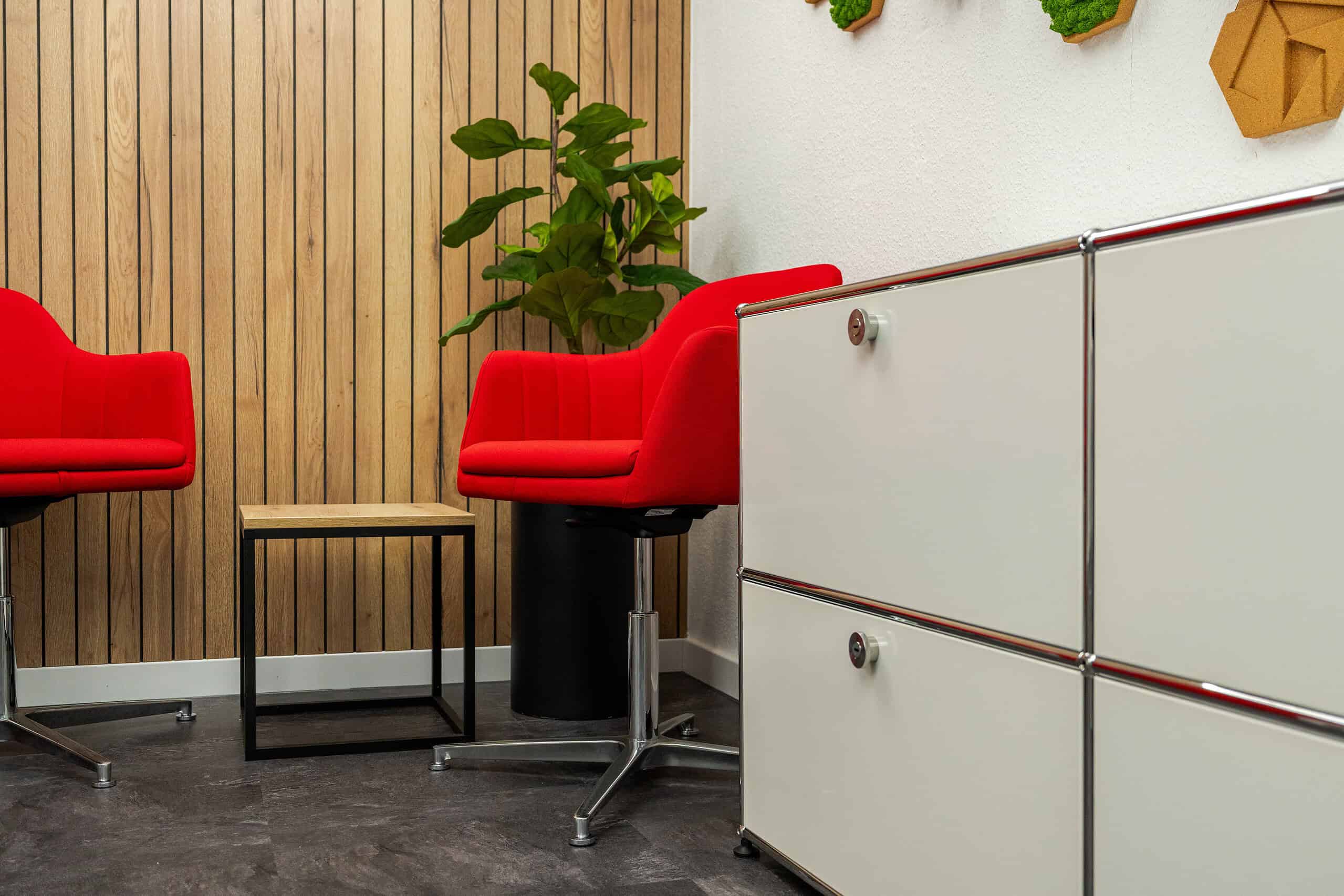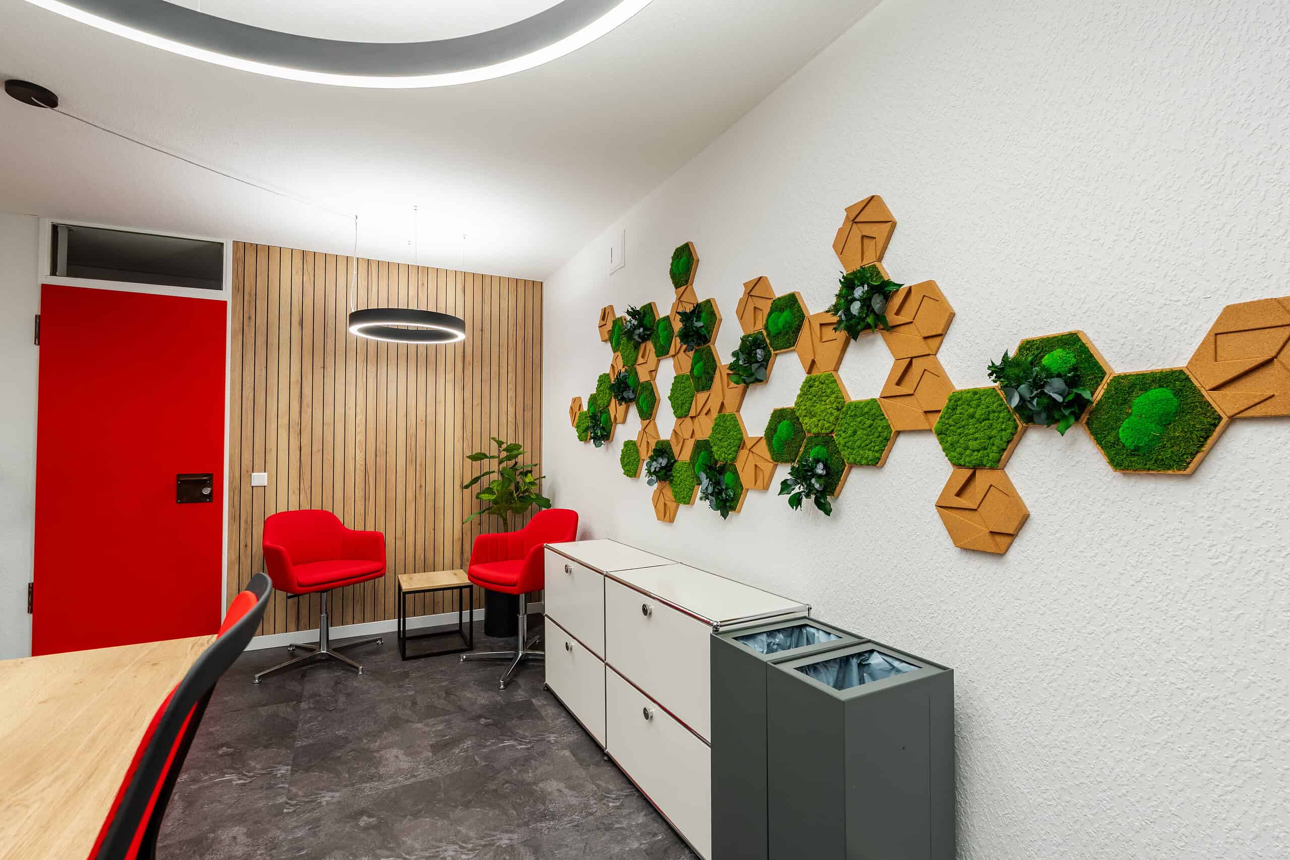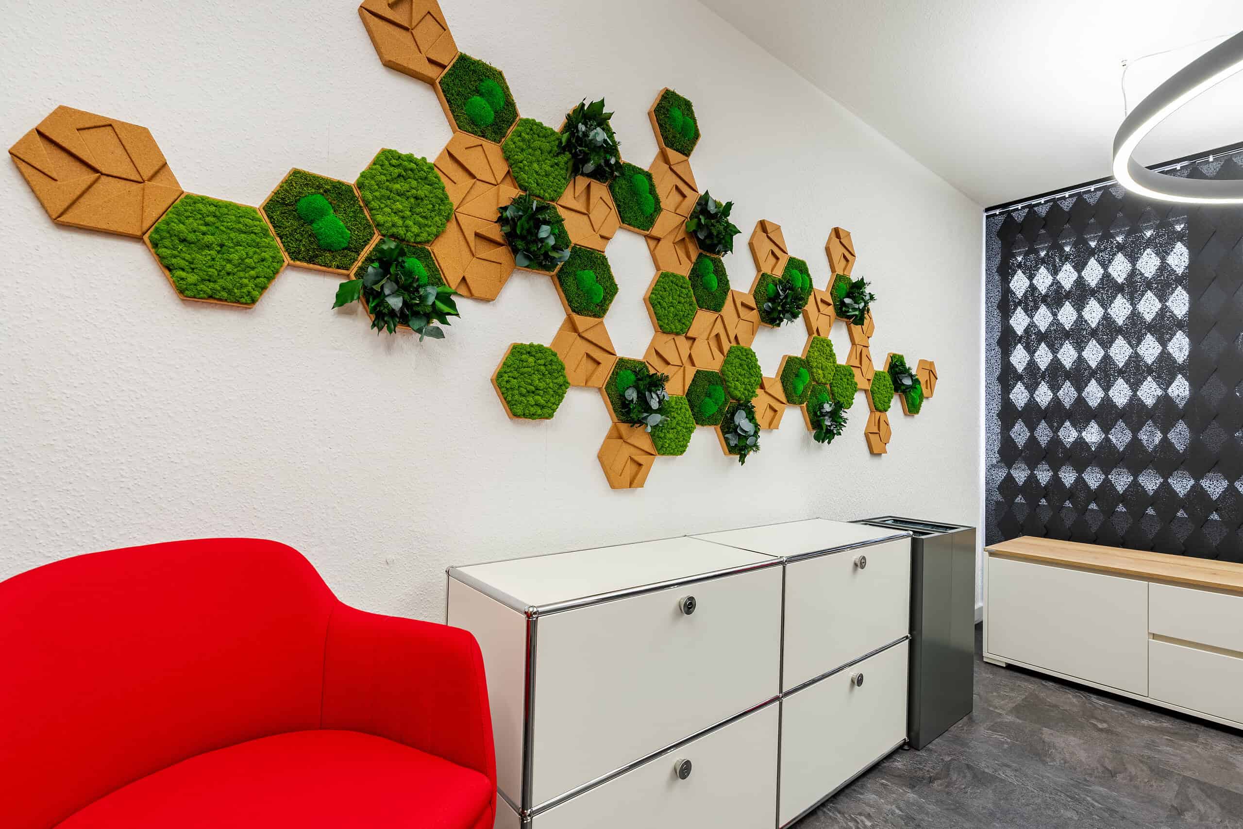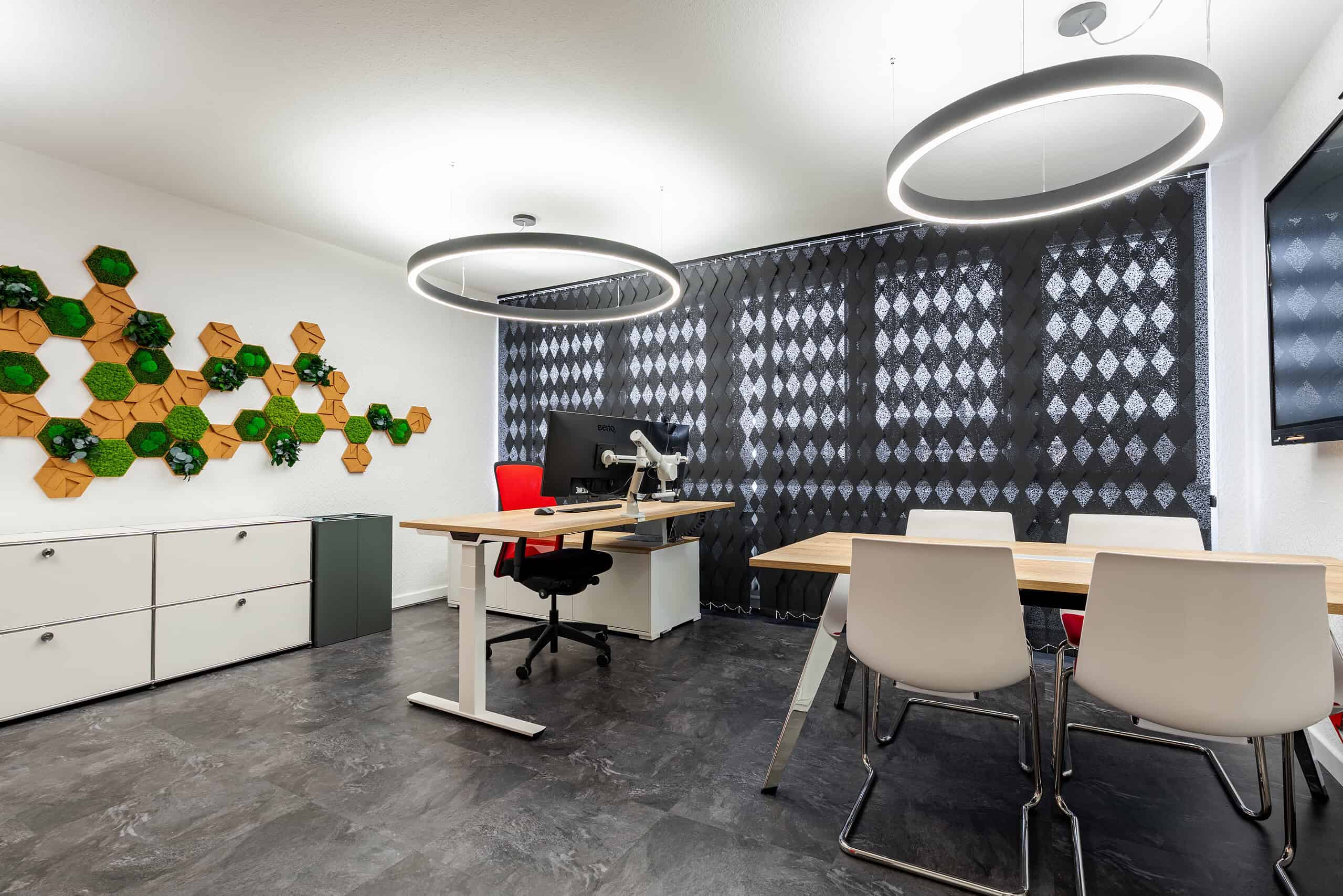Zum Einsatz kamen Produkte namhafter Hersteller wie Palmberg, Interstuhl, TANAMAN, Stylegreen, Dataflex, USM, Legamaster, Lichtagentur und Interface.