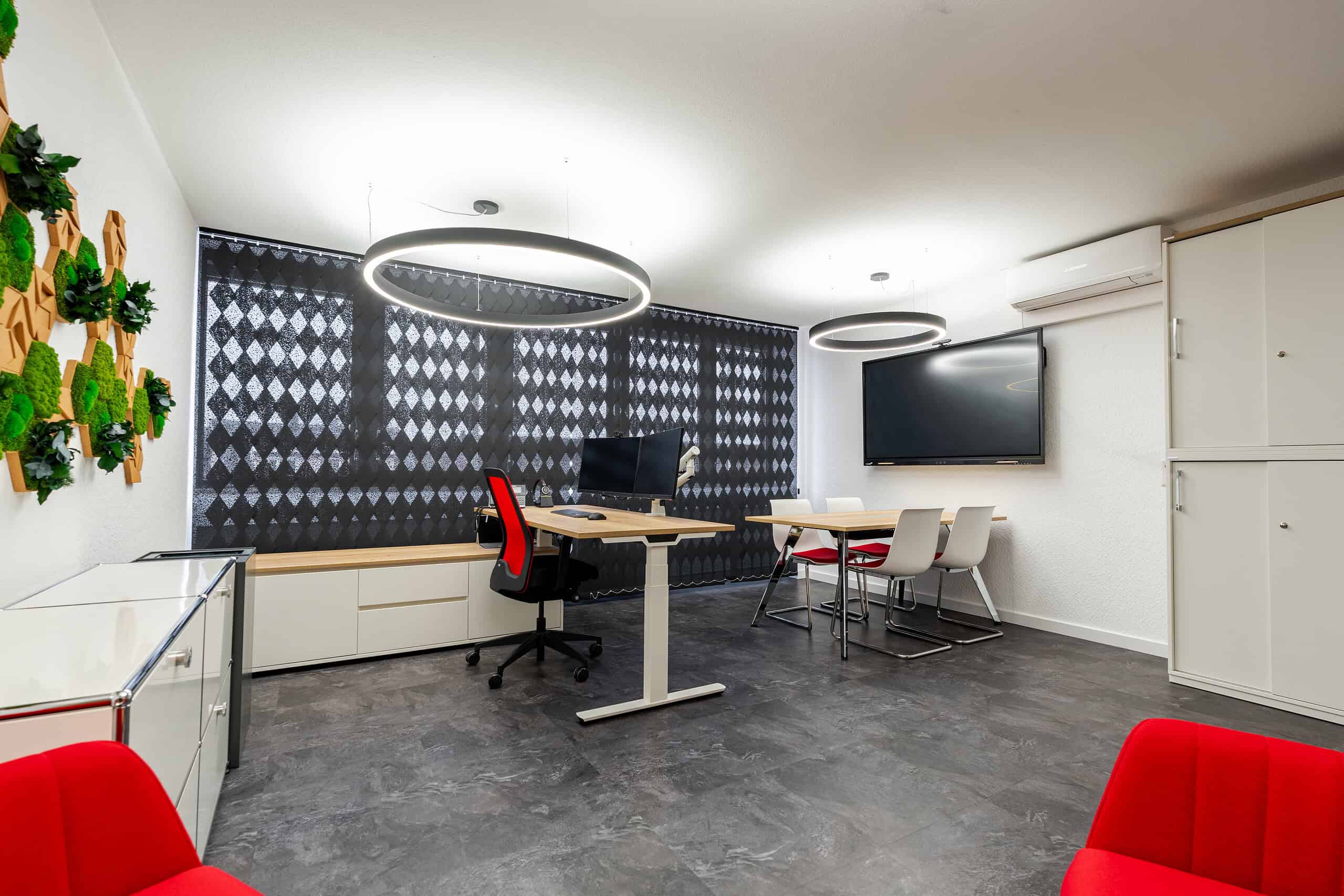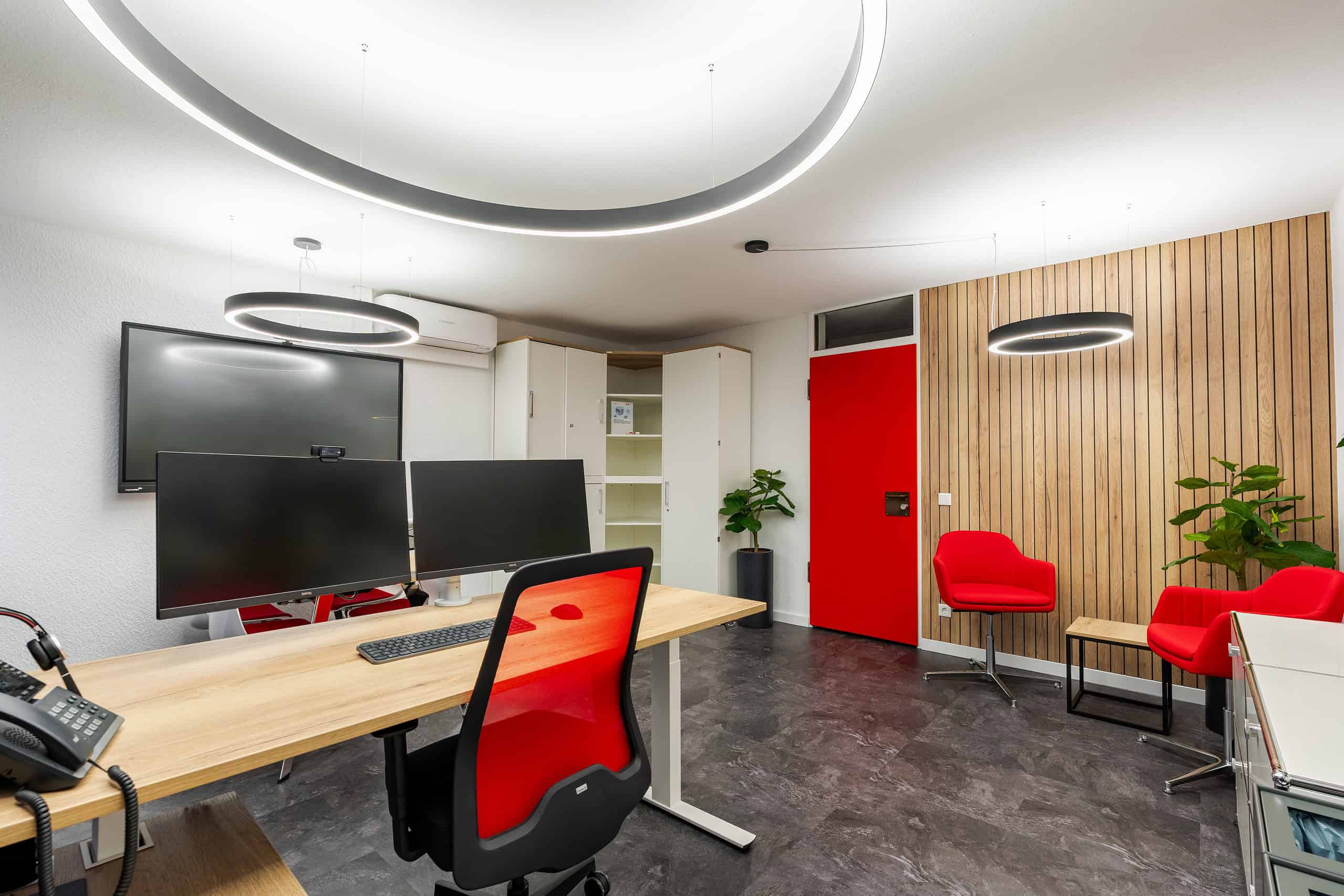 Im Rahmen des Projekts BRK Amberg wurde das Chefbüro vollständig neugestaltet und ausgestattet. Der Fokus lag auf einer klaren, hochwertigen Gestaltung, die sowohl den funktionalen Anforderungen als auch dem repräsentativen Charakter des Raumes gerecht wird.