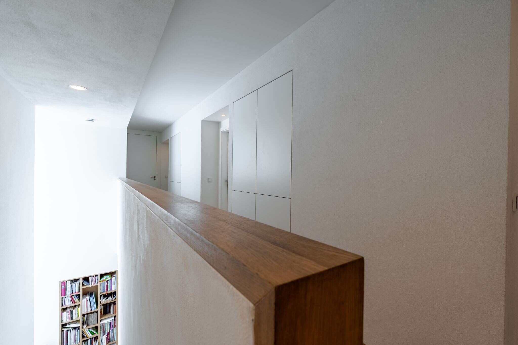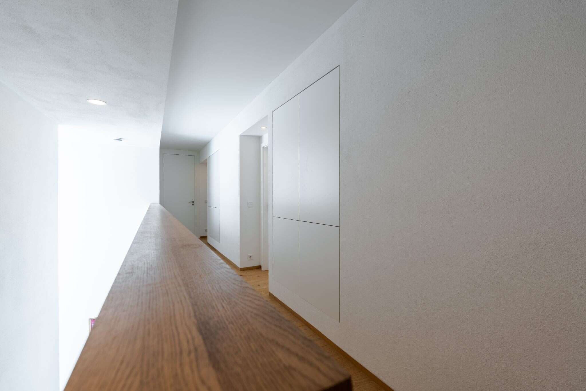 In enger Abstimmung entstand eine individuelle Lösung, die sich passgenau in die Architektur einfügt und durch ihre klare, grifflose Gestaltung besonders harmonisch wirkt. Die wandbündige Ausführung sorgt für eine aufgeräumte Optik und lässt die Schränke nahezu mit dem Raum verschmelzen.