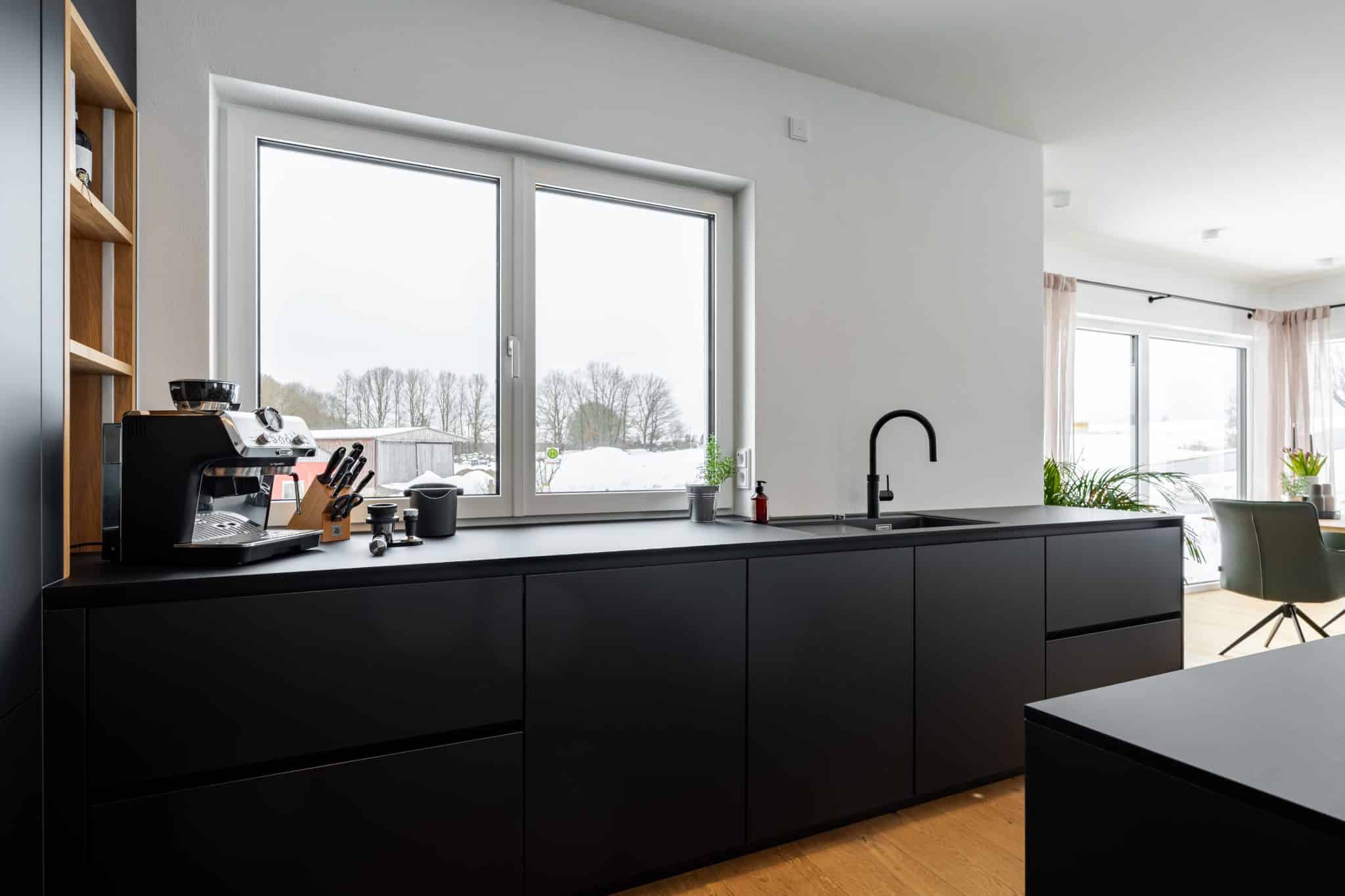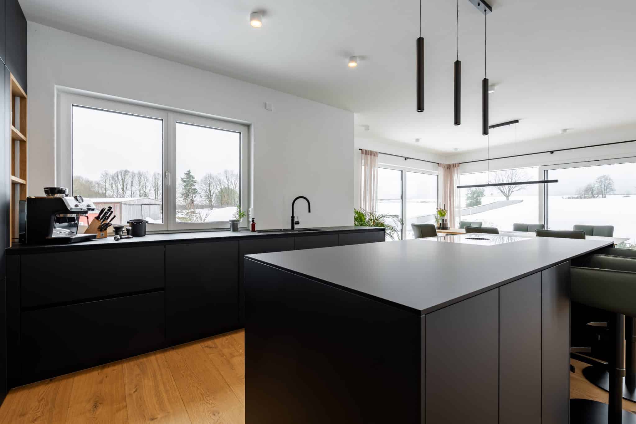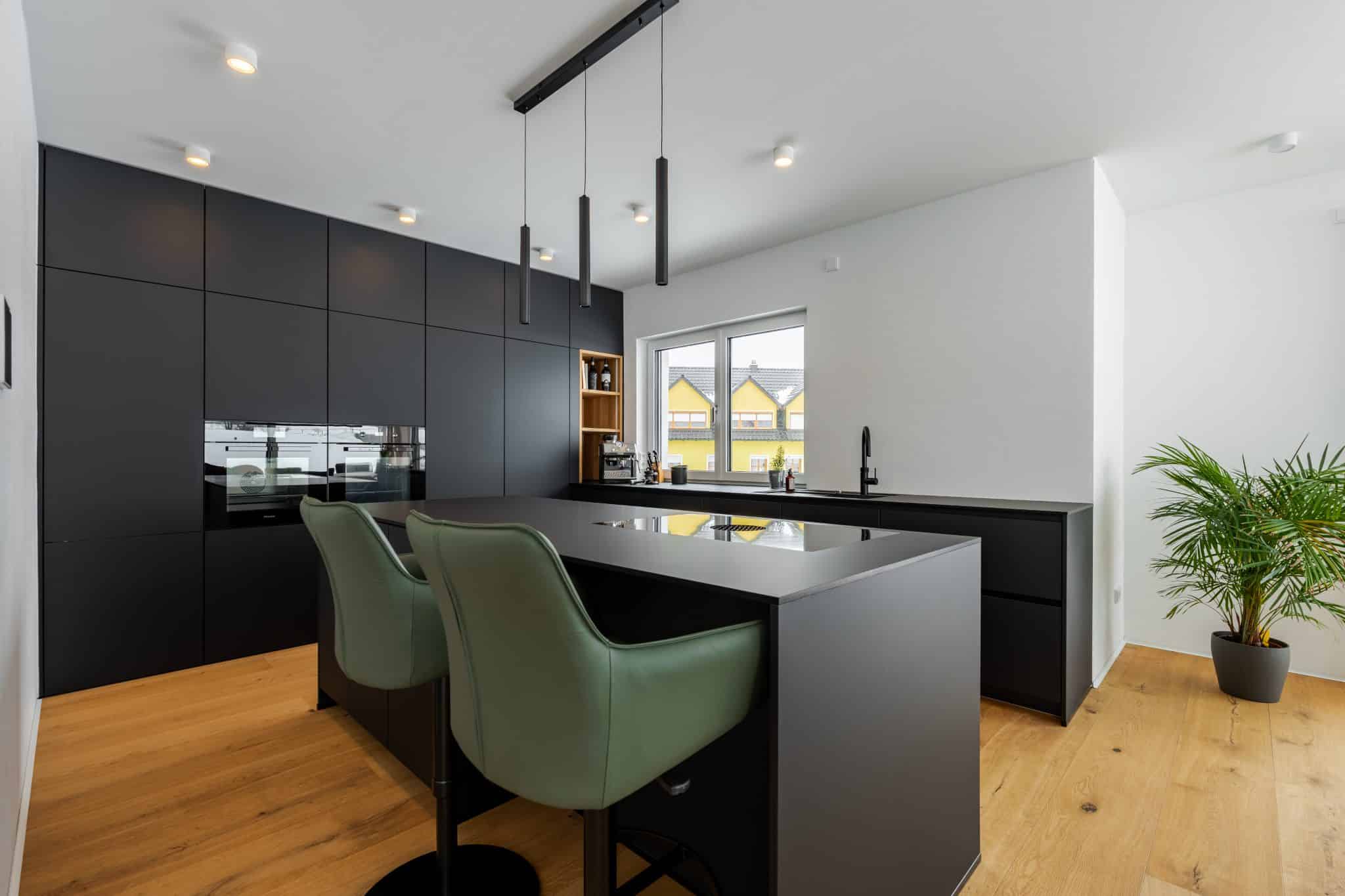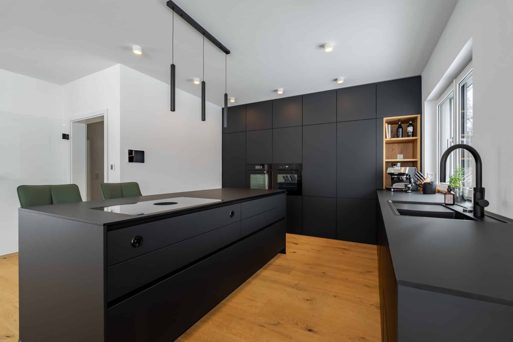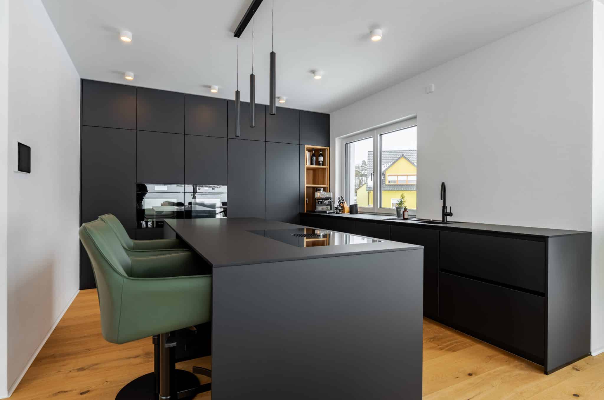 Für unseren Kunden durften wir eine beeindruckende schwarze FENIX-Küche mit großzügiger Kücheninsel realisieren. Ziel war es, ein modernes, klares Design mit höchster Funktionalität zu verbinden.